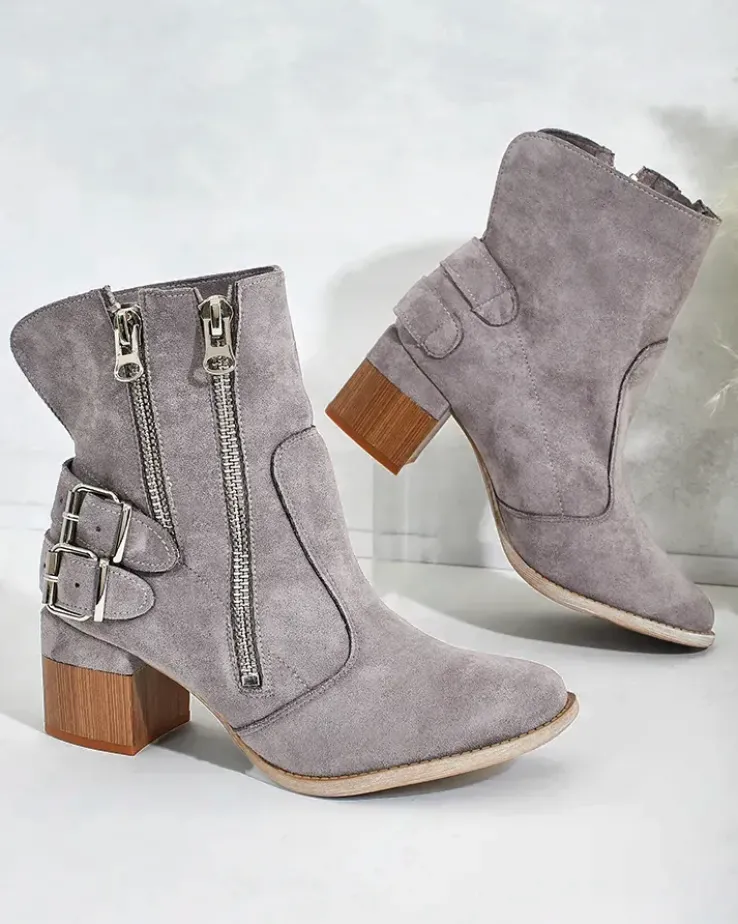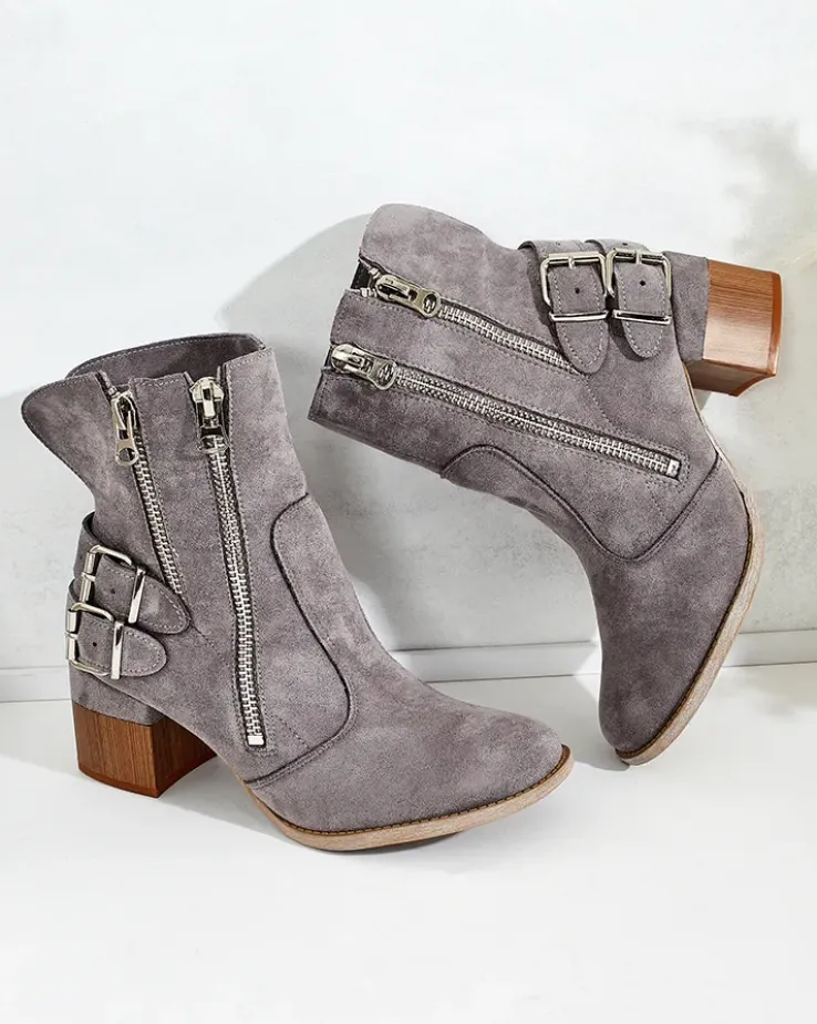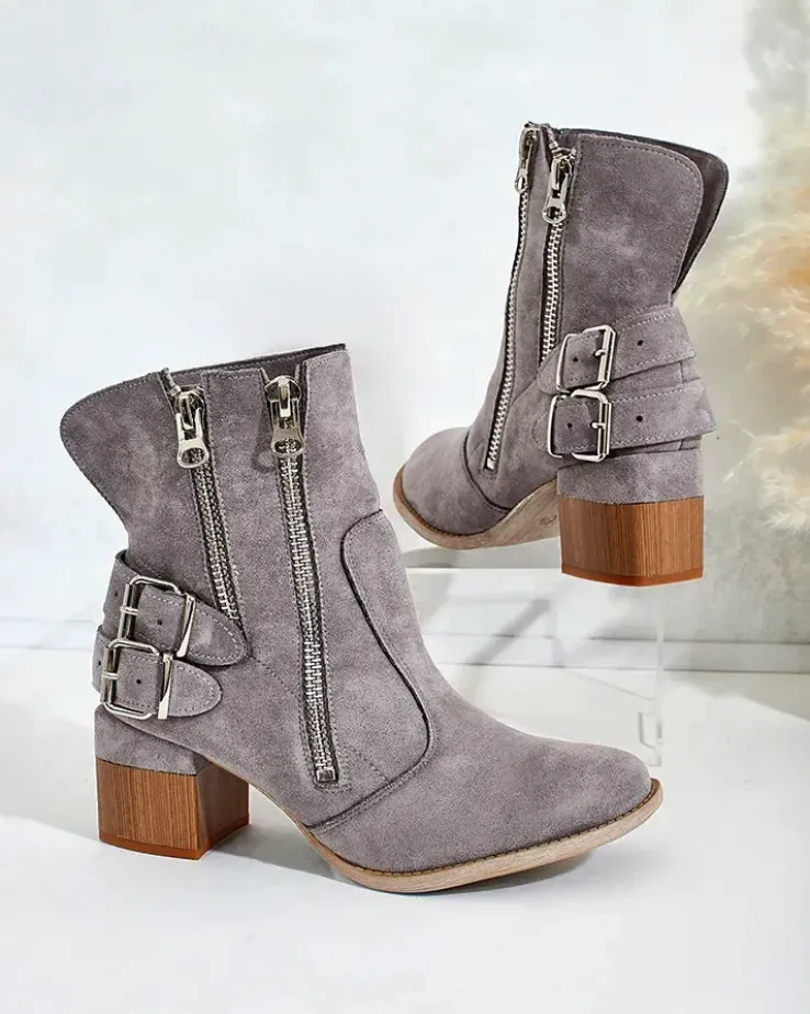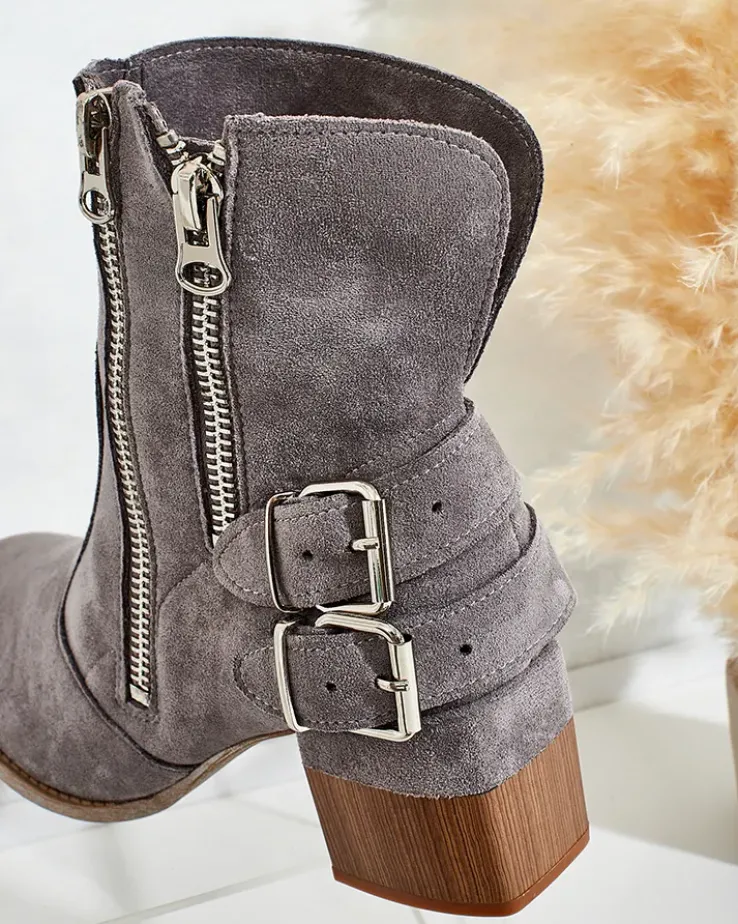 - Stylowe damskie botki na słupku z cholewką zdobioną sprzączkami. Obuwie z eko-zamszu, w środku tkaninowa wkładka. Model zapinany na suwak po wewnętrznej stronie.