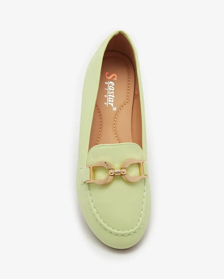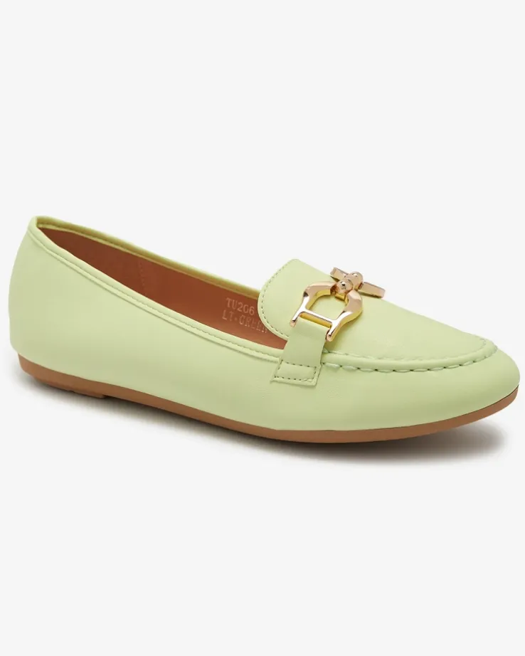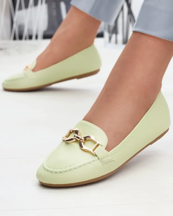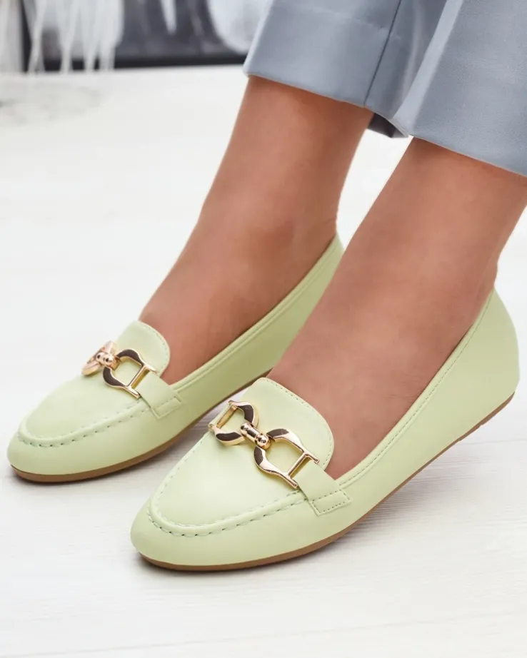 - Damskie mokasyny ze złotą ozdobą, model jest wykonany ze skóry ekologicznej. W środku miękka wkładka eko-skórzana z poduszeczkami, która dostarczy komfortu. Idealna baza dla wielu codziennych looków!
