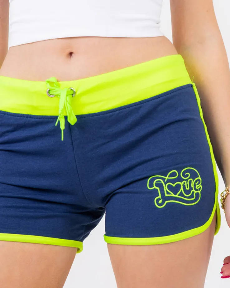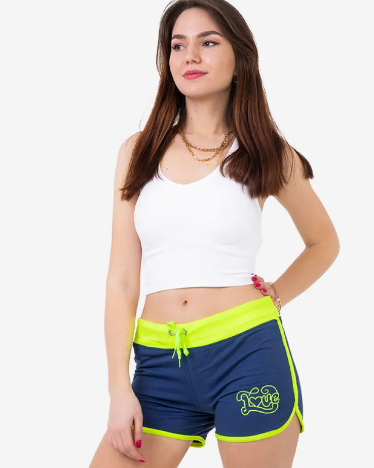 Royalfashion Żółto – niebieskie krótkie spodenki z naszywką LOVE