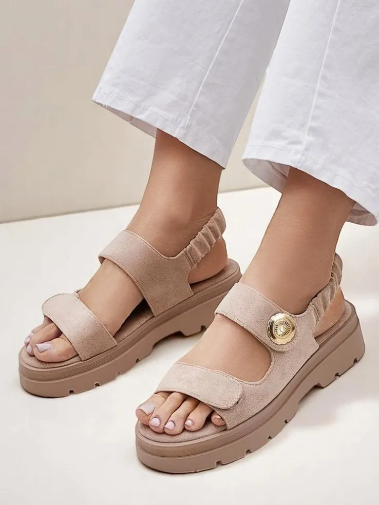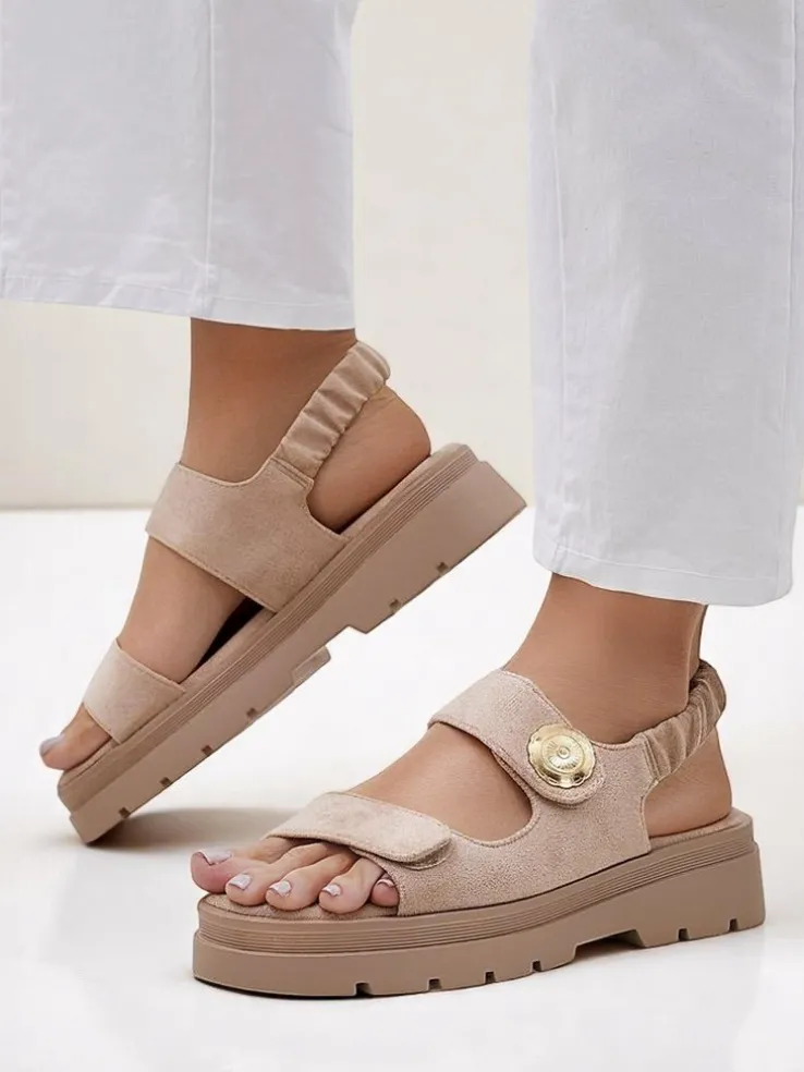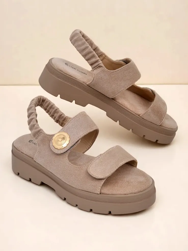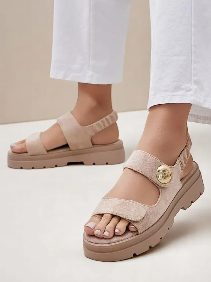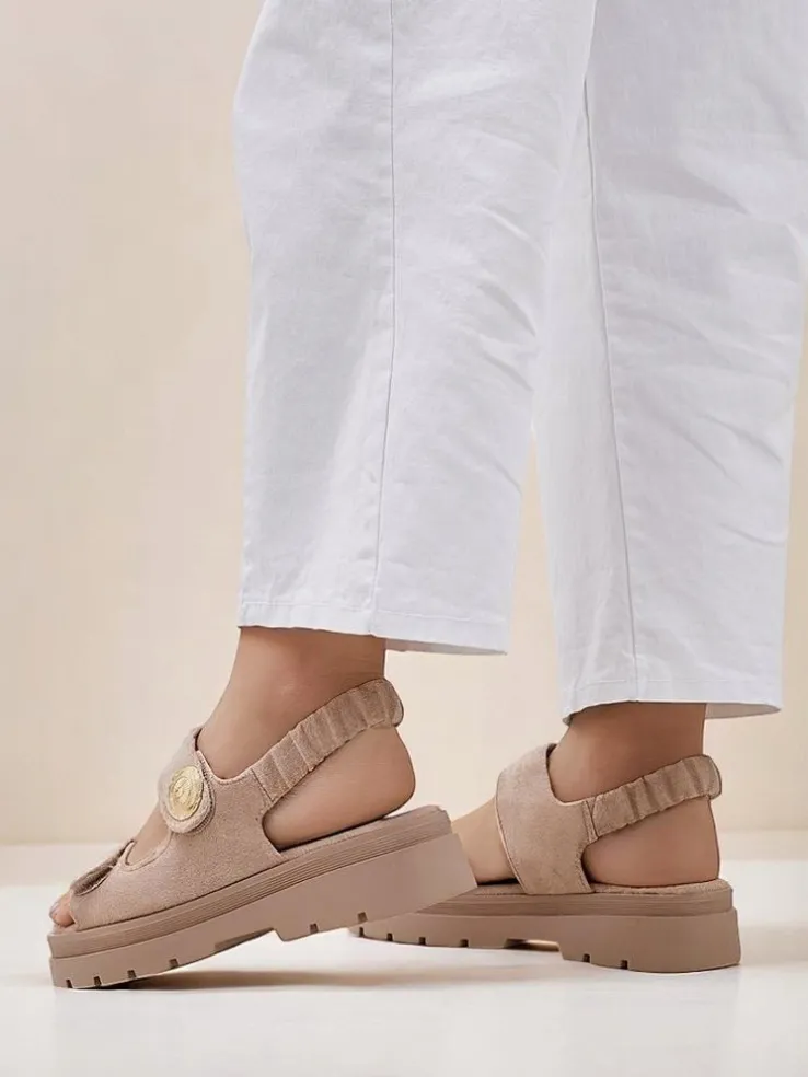 - Damskie sandałki na niskiej podeszwie – to idealny pomysł na gorące letnie dni. Model wykonany z eko skóry zamszowej. Podeszwa udekorowana ozdobnymi klamerkami. Obuwie wsuwane z gumką na pięcie. Połączenie stylu i wygody!