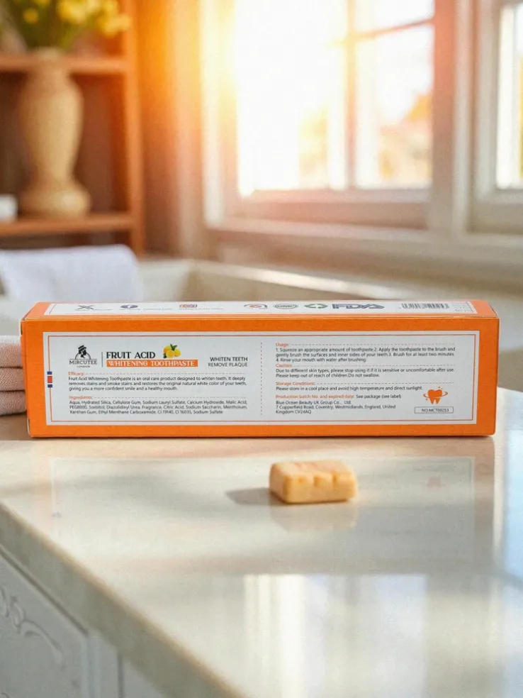 - Wybielająca pasta do zębów o owocowym smaku. Skutecznie usuwa przebarwienia, odświeża oddech i zapewnia długotrwałe uczucie czystości. Delikatna dla szkliwa, idealna dla tych, którzy lubią słodką świeżość.